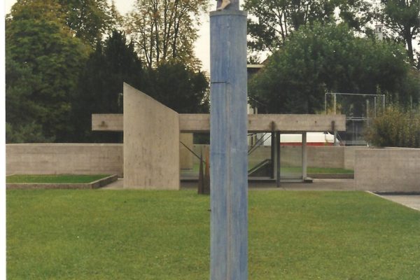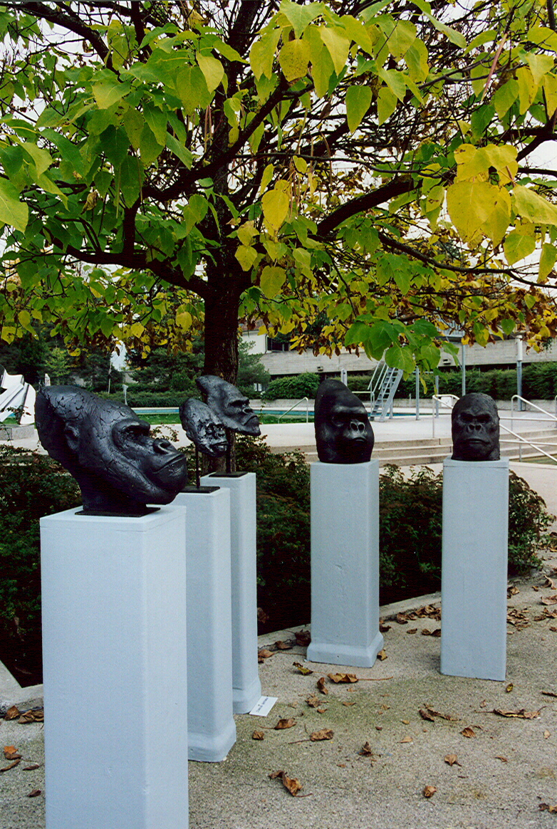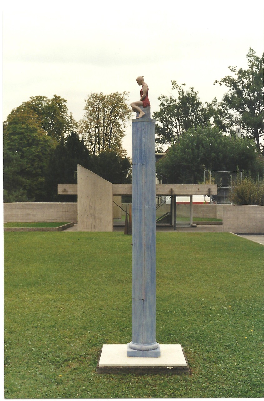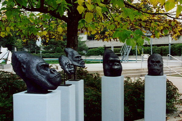 Quadriennale de Lancy 18.09.1999 - 17.10.1999 Piscine de Marignac Quelques œuvres exposées Gorilles Isabelle Battolla modelage Femme sur sa colonne Lukas Grogg polyester, divers matériaux