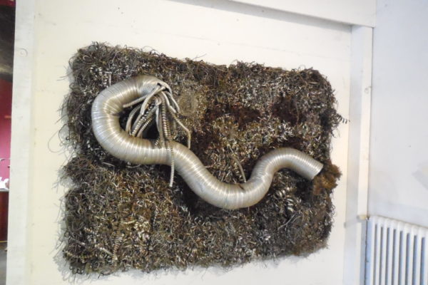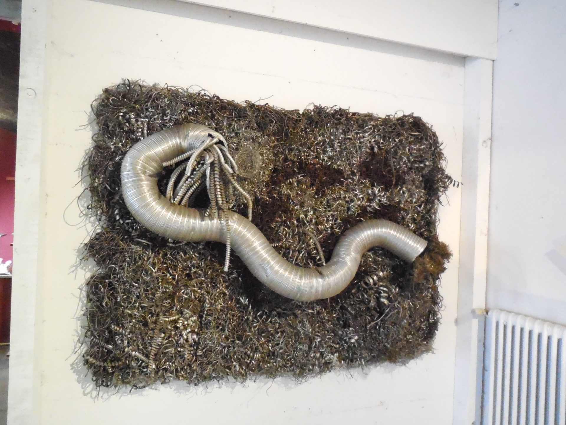 Réalisation de « tapisseries » – structures planes ou spatiales imbriquées de matériaux divers : bois, métaux, soies, cotons, laines, cordes, pellicules ciné, bandes magnétiques, papiers, caoutchouc, mousses synthétiques, plastique, etc…